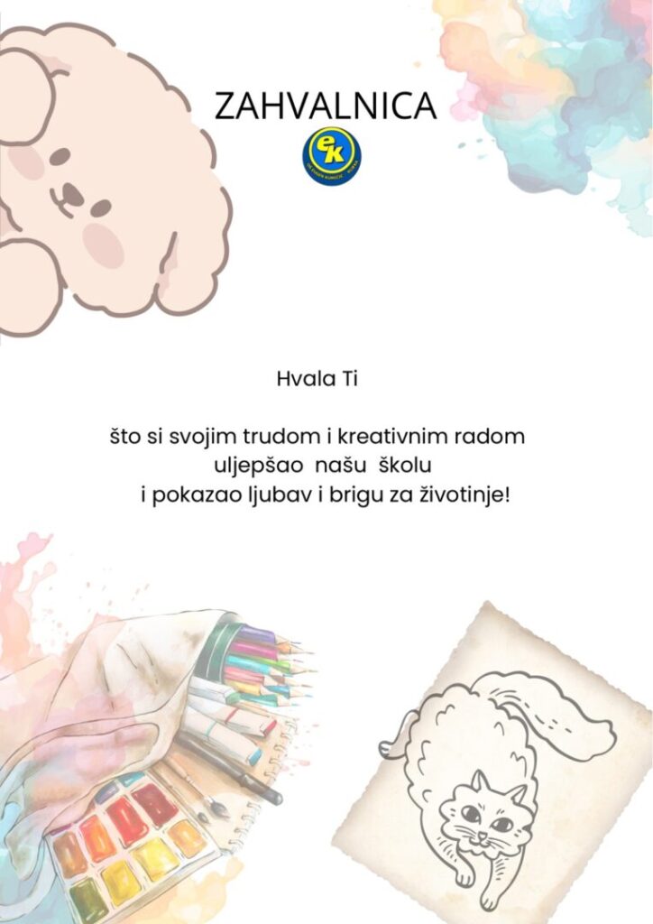 Početkom listopada, u povodu Dana životinja u školi smo organizirali likovni natječaj „Volim životinje“ i humanitarnu akciju prikupljanja hrane i deka za Azil u Rijeci. Učenici su tako mogli izraziti svoju ljubav i brigu o životinjama, a samim time i uljepšati prostor naše Škole. Na likovni natječaj se javilo puno učenika, a najviše su se istaknuli naši najmlađi učenici. Svi učenici koji su sudjelovali na likovnom natječaju dobili su zahvalnicu Škole za promicanje ljubavi i brige prema životinjama. Zahvaljujemo svima što su svojim sudjelovanjem u humanitarnoj akciji doprinijeli radu Azila u Rijeci, a možda smo nekoga potaknuli da se umjesto kupnje odluči udomiti psa i učiniti veliko djelo ljubavi. Hvala svima i nastavimo činiti ovaj svijet ljepšim!